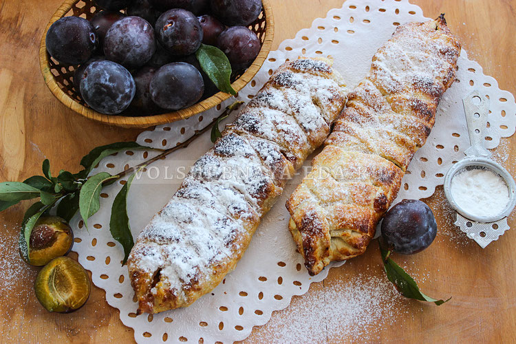 А давайте испечем слоеный пирог со сливами в форме плетенки? Румяное хрустящее тесто, а внутри — сочная, очень ароматная начинка. Тесто не обязательно готовить самостоятельно. Вполне подойдет покупное слоеное (бездрожжевое). Как правило, в упаковке оно уже раздело на пластины. На одну плетенку понадобится одна пластинка теста — это 250 грамм, так что все пропорции в рецепте я привела из расчета на эту порцию теста. Полезные советы: Слоеное бездрожжевое тесто заранее разморозить. Немного раскатать, чтобы пласт стал тоньше. При этом важно не перестараться и не нарушить слоистость теста, иначе оно получится жестким, плохо поднимется. Скалкой нужно раскатывать только в одном направлении, аккуратно, не сминая края теста. У меня получился прямоугольник 30х18 см. Сливы помыть, обсушить (обязательно), удалить косточки, нарезать кусочками. Выложить по центру заготовки. Посыпать сахаром и крахмалом (удобнее через ситечко). С помощью ножа для пиццы сделать боковые надрезы — полоски. Сложить пол