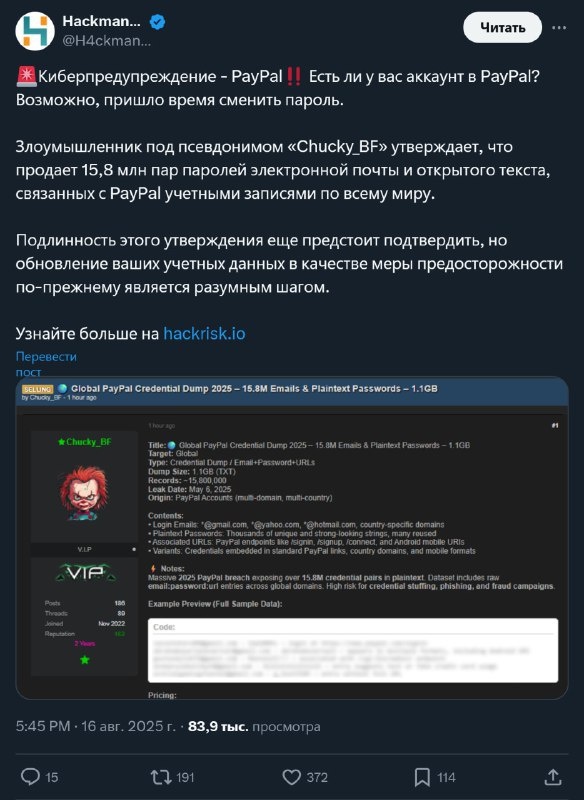 Хакер под ником Chucky_BF выложил базу на 15,8 млн аккаунтов с логинами и паролями в открытом виде. Говорят, что данные уже гуляют по продажам.