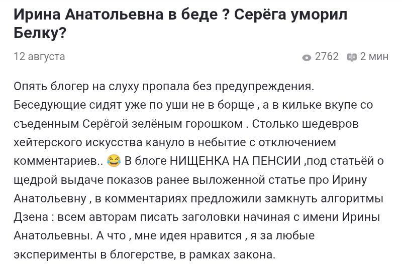 Очень интересно, а кто это и что она там делает? В этом самом биде. Не отметился на теме жизни некой Ирины свет Анатольевны только самый ленивый блогер. Настала и моя очередь. Я хоть и не блогер и довольно ленива, но хайпануть не откажусь. Маргиналов я люблю. Мой папенька, царствие ему небесное, был знатный алконавт, поэтому жизнь и обычаи этой категории россиян мне хорошо известны. Живут они недолго, но очень весело. Украл, выпил -- в тюрьму! Эту фразу я помню с детства. Папаша мой так и делал, раз семь, не меньше, ходил в места не столь отдаленные, и все по-пьяни. Да так жили все. Все-все, и начальство, и работяги. Пили все и не надо притворяться, что это не так. На тех, кто не пил, если вдруг такой чудик обнаруживался, смотрели косо -- не наш человек! А уж на халяву, пили и трезвенники и язвенники. Тоже знакомая с детства фраза. Так что не надо осуждать. Так что же с Ириной-то Анатольевной? А что с ней не так? Пила и даст бог ещё немало выпьет. Трижды вдова, заслуженный человек,
