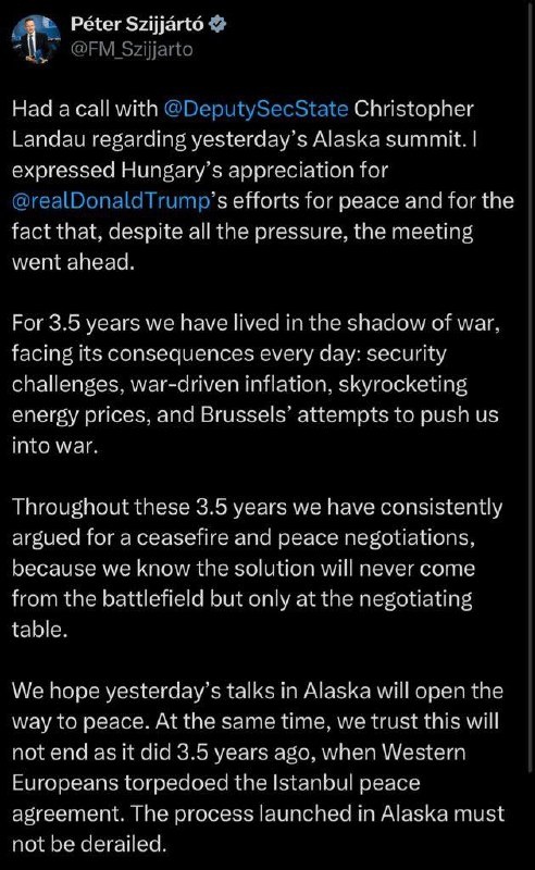 Hungary APPRECIATES Trump’s ‘efforts for peace’ — FM Szijjártó after Alaska Summit Brussels is trying to ‘PUSH’ his country ‘into war’ Europe ‘TORPEDOED’ the Istanbul peace deal 3.5 years ago ‘We trust this will not end as it did 3.5 years ago’
