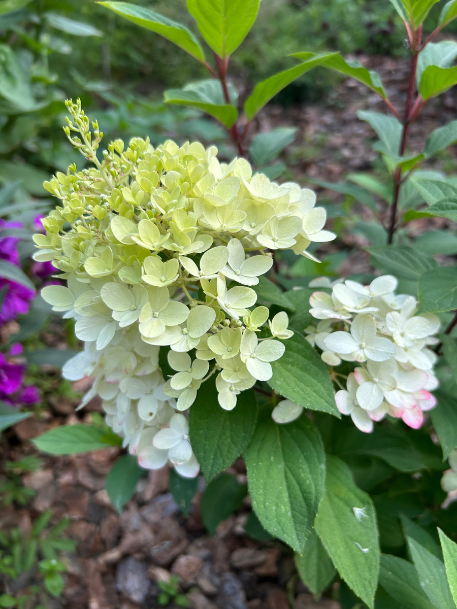Меня привлекла округлая форма соцветий. К тому же у этой гортензии цвет меняется с зеленого на кремовый и на финише сезона становится светло-розовым с изумительными сочетаниями оттенков. С учетом того, что одни соцветия распускаются раньше, другие позже, это так же даст перелив цвета, как и соседнего Коктейля. Только цвет уйдет не в малиновый, а в розовый. Надеюсь, будет красиво.