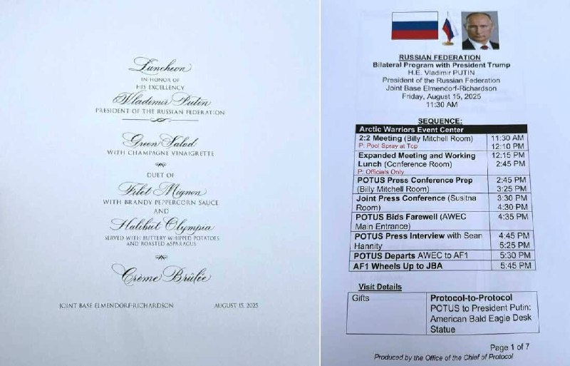 ‘Potentially SENSITIVE’ US State Dept. papers on Putin–Trump meeting left in an Alaskan HOTEL — NPR 8 pages REVEAL exact locations and times of summit, and phone numbers of US staff Most importantly — we finally get the luncheon MENU