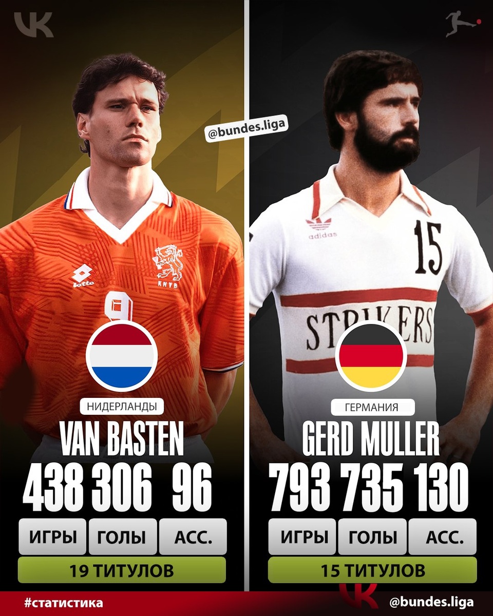 Ван Бастен 🆚 Герд Мюллер. Какая карьера впечатляет больше❓ С одной стороны Ван Бастен - элегантный мастер. С другой Герд Мюллер - немецкий бомбардир, синоним к слову гол! Что объединяет этих легенд? Ван Бастен завершил карьеру в 1993 году из-за хронической травмы лодыжки. Ему на тот момент было 29 лет. Герд Мюллер завершил международную карьеру в возрасте 28 лет ... из-за желания больше проводить времени с семьёй. 👉 Ван Бастен: 🎯 438 игр ⚽ 306 голов 🎁 96 передач 🏆 19 титулов 👉 Герд Мюллер: 🎯 793 игры ⚽ 735 голов 🎁 130 передач 🏆 15 титулов Какая карьера впечатляет больше❓