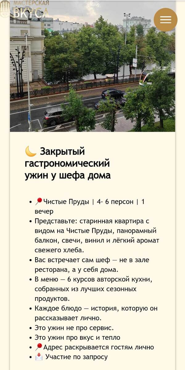 Авторский ужин у шефа дома Мы приглашаем вас в гости к нашему шефу — на тёплый и камерный гастро-ужин, где еда превращается в историю, а вечер — в воспоминание. Когда вы войдёте, мы предложим вам напитки и лёгкие закуски. Шеф лично расскажет о себе, своём кулинарном пути и вдохновении, которое привело к сегодняшнему меню. Каждое блюдо будет сопровождаться коротким рассказом о его вкусе, происхождении и особых деталях приготовления. Вы сможете задать любые вопросы — о сочетаниях продуктов, авторских техниках или любимых гастрономических открытиях шефа. Вечер пройдёт в камерной атмосфере за красиво сервированным столом, с тёплым светом, тихой музыкой и интересной беседой. Количество мест ограничено, чтобы каждому гостю хватило внимания и вкуса.