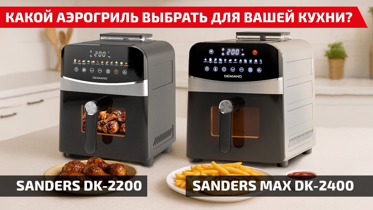 Выбор аэрогриля — это больше, чем просто «взять помощника для кухни». Это про то, чтобы готовка стала проще, быстрее и вкуснее. Удобный прибор должен соответствовать вашему образу жизни: кто-то живёт один и ужинает дома всего пару раз в неделю, а кто-то каждый день кормит большую семью. Мы собрали полное сравнение двух популярных моделей Demiand Sanders — DK-2200 и Sanders Max DK-2400— чтобы вы точно знали, какая станет вашим идеальным кухонным партнёром. 1️⃣ Sanders DK-2200 (6 литров) Подойдёт, если: Что внутри: 💡 Пример из жизни: Представьте вечер после работы. Вы устали и совсем не хотите возиться с духовкой или плитой. Бросаете в чашу пару куриных бёдер, овощи, нажимаете кнопку — и через 25 минут у вас полноценный ужин, а кухня остаётся чистой. Ссылка на Sanders DK-2200 на WB 🛍 2️⃣ Sanders Max DK-2400 (9 литров) Подойдёт, если: Что внутри: 💡 Пример из жизни: Пятница, вы ждёте друзей. В Sanders Max легко уместится целая курица и противень картофеля. Не нужно включать духовку и жд
