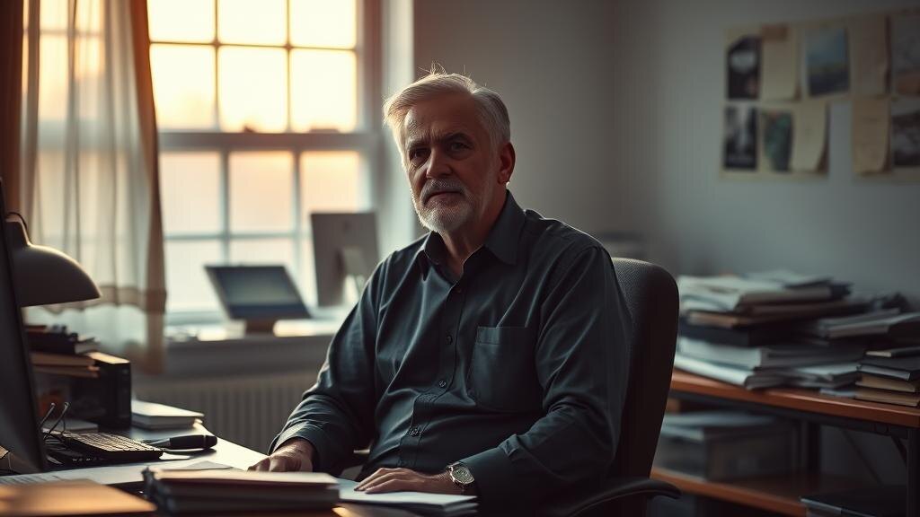 Он вспоминает, как утром не успел допить кофе, как Светлана приносила бумаги, как начальник упрекал его при всех. Всё это складывается в цепь, которую хочется разорвать. Бумаги с пометками лежат стопкой, как немой укор, а пальцы дрожат, когда он тянется к клавиатуре.