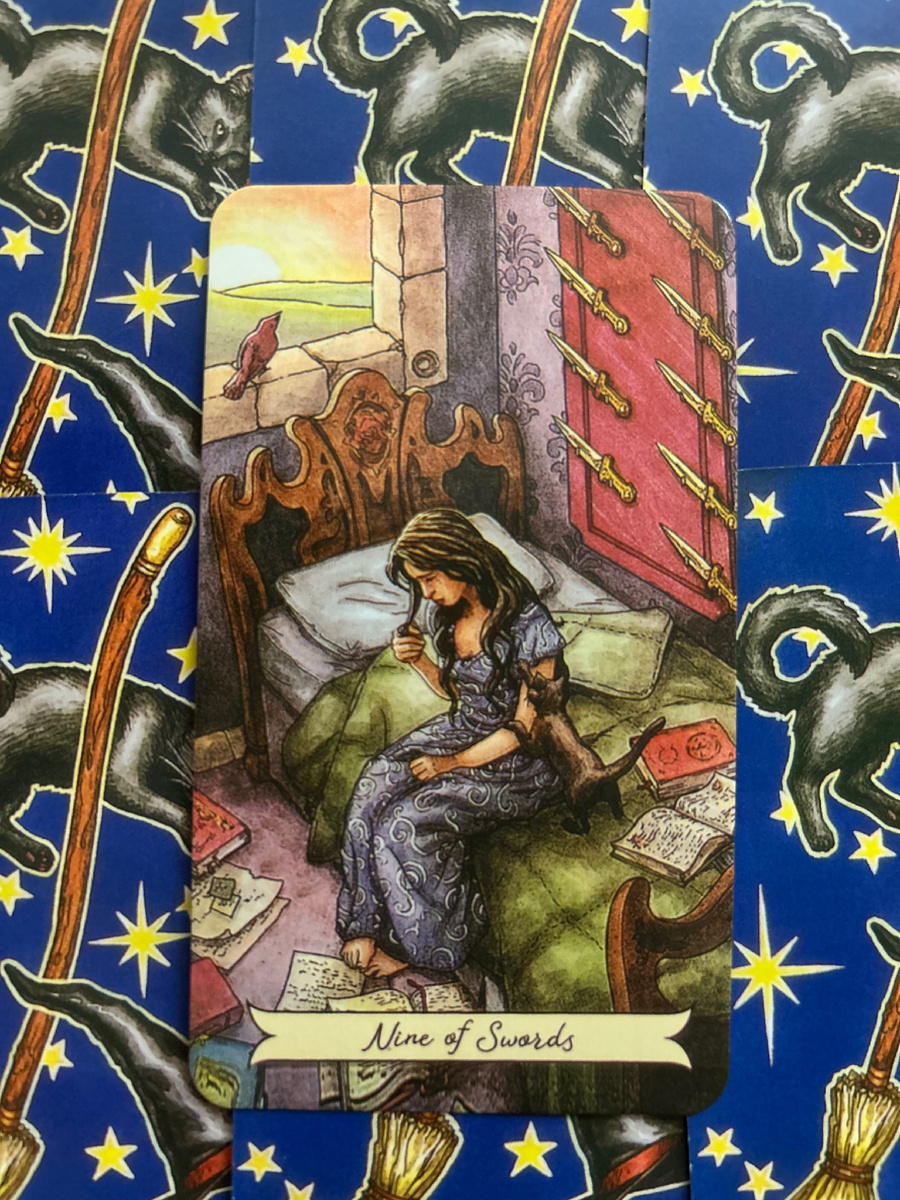 Если вы хоть раз лежали ночью с открытыми глазами, прокручивая в голове все возможные сценарии «а вдруг», то поздравляю — вы проживали Девятку Мечей. Это карта тревоги, страхов и ночных кошмаров, которые приходят, когда разум не справляется с потоком эмоций. Это аркан тревожности и паники. На карте обычно изображён человек, сидящий в постели, закрыв лицо руками. Девять мечей нависают над ним, как мысли, что давят на голову. Ключевое: это не реальность, а проекции ума. То, чего мы боимся, почти всегда страшнее того, что есть на самом деле. — Вы сказали коллеге неловкую фразу и теперь неделю переживаете, что «все будут помнить». — Вам кажется, что партнёр вас предаст, хотя доказательств нет. — Перед экзаменом вы уверены: «Я всё забуду, все будут смеяться». — Утром у вас встреча, а ночью вы крутитесь, как на сковородке, потому что мозг не выключается. Это всё Девятка Мечей — не события, а ночные тени, которые сами же увеличиваем. 9 Мечей часто говорит о ревности, подозрениях и внутренни