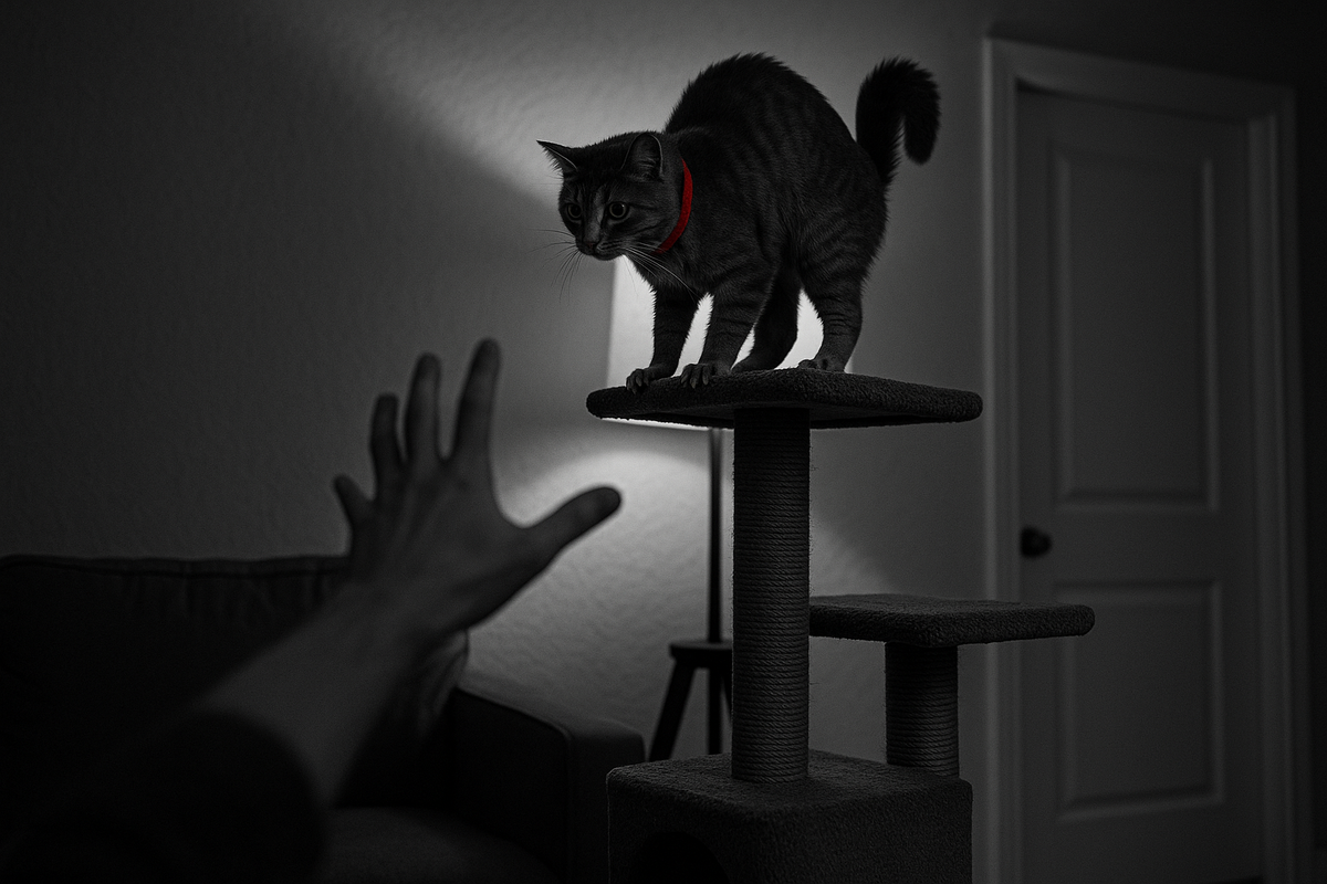 Однажды я попыталась выманить его из внезапного ужаса горстью лакомств. Как только я приблизилась на фут, из его горла поднялось низкое рычание. Он сорвался с места и умчался в соседнюю комнату, где я нашла его на верхушке его «кошачьего дерева», как раз чуть выше моей досягаемости. Там он и просидел остаток ночи. Я снова услышала, как он шуршит по дому, только когда легла спать.