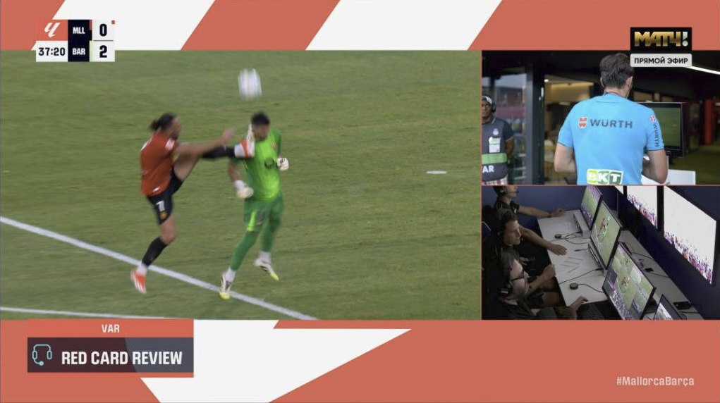 Команды встречаются в 1-м туре чемпионата Испании, счет к перерыву – 2:0 в пользу «блауграны». Хозяева остались в меньшинстве уже на 33-й минуте, когда полузащитник Мануэль Морланес получил вторую желтую карточку за нарушение правил на Ламине Ямале. Первую главный судья Хосе Мунуэра Монтеро продемонстрировал испанцу на 24-й минуте за споры. На 36-й минуте нападающий Ведат Мурики ударил вратаря «Барселоны» Жоана Гарсию ногой в голову или шею на линии штрафной площади. Сперва арбитр предупредил футболиста сборной Косово, но после изучения повтора решил удалить. Таким образом, первый тайм «Мальорка» доигрывала вдевятером. Изображение: кадр из трансляции «Матч ТВ» «Мальорка» – «Барселона». 0:2 – Рафинья и Ферран забили, Морланес и Мурики удалены! Онлайн-трансляция
