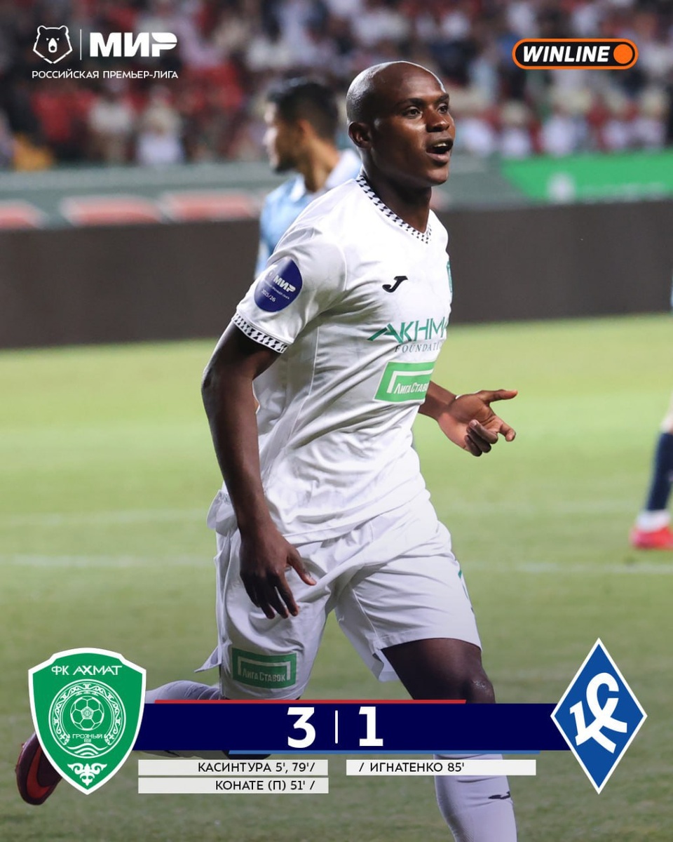 ⚽️⚽️ «Ахмат» победил «Крылья Советов» в пятом туре РПЛ — 3:1. В составе победителей дубль оформил Эгаш Касинтура (5-я минута, 80-я), ещё один гол забил Мохамед Конате, реализовавший пенальти (51-я). Единственный мяч самарцев — на счету Владимира Игнатенко (85-я). «Ахмат» набрал шесть очков и занимает девятое место в турнирной таблице чемпионата России. На счету «Крыльев Советов» восемь очков и пятая позиция. @russian_rt_sport