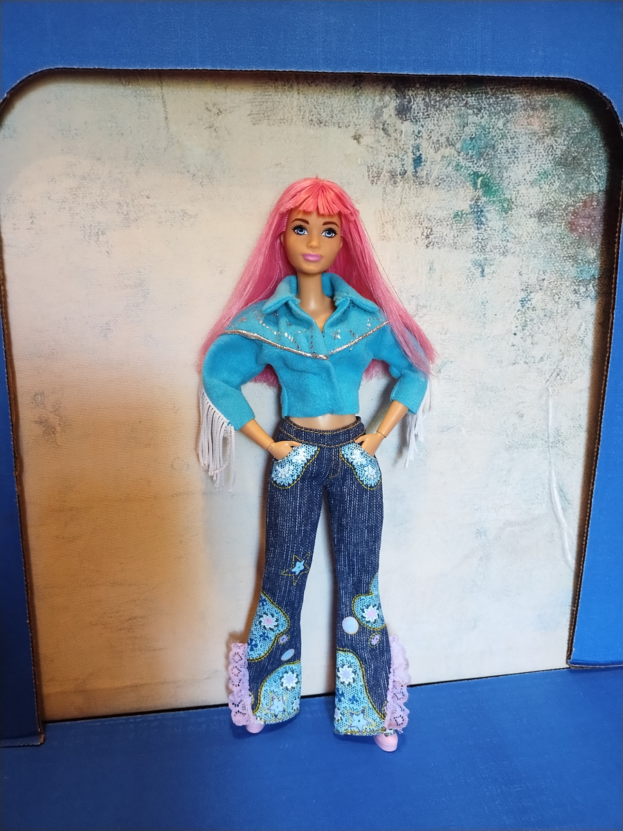 Волосы у нее розовые, уже нестандарт, одела я ее в расклешенные вышитые джинсы - очень были модны именно в 70х, время моей молодости.