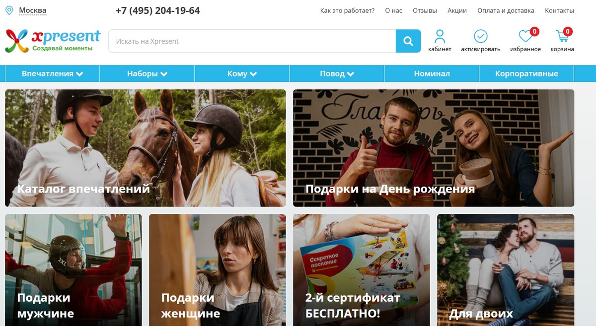На сайте представлены подарочные наборы, а также сертификаты на впечатления и в известные магазины.