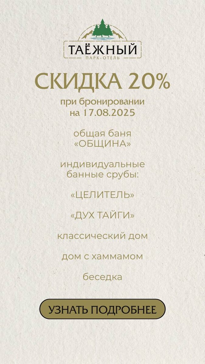 Воскресный отдых в «Таёжном» со сказочной выгодой 😍 Скидка 20% на «ОБЩИНУ», аренду домов, индивидуальных банных срубов и беседок! ➡️ только при бронировании на 17.08.2025 написать менеджеру забронировать online на сайте До встречи 💚