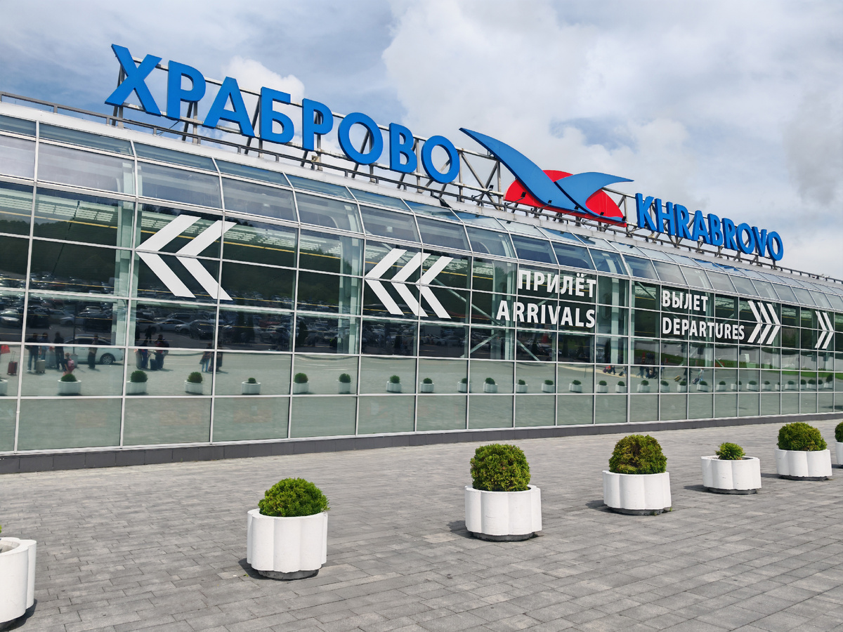 Выходя из терминала аэропорта Храброво следуйте к автобусной остановке, которая находится справа от здания.