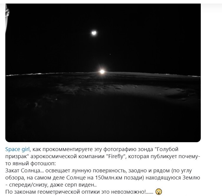 Так чего же не понял наш альтернативно одаренный ученик? Да собственно говоря ничего. Например он не разобрался как меняются фазы Земли на Лунном небе, и как при этом может светить Солнце. При этом он ошибочно пытается объяснять простые на первый взгляд явления, и даже рисуя схемы в которых и сам не может разобраться. Но при этом его главная задача - заявить про фотошоп и фейки, коих на снимках лунного зонда Blue Ghost не наблюдается.