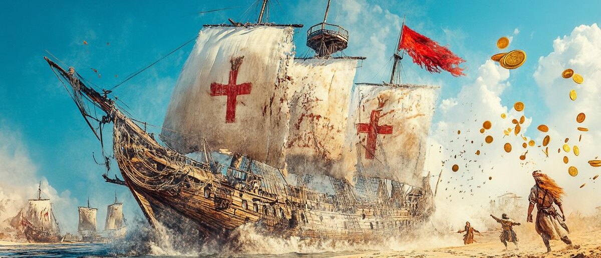 Утро, когда океан родил горы Гуакан проснулся от тишины. Не от крика попугаев, не от шума прибоя — от тишины, которая бывает только перед тем, как мир переворачивается. Карибское утро 12 октября 1492 года пахло солью и чем-то ещё. Чем-то, для чего у восемнадцатилетнего индейца не было слов. Старики потом скажут — пахло концом света. Но старики всегда так говорят, когда уже всё случилось. Он вышел на берег и замер. Там, где вчера была только линия горизонта, теперь стояли три горы. Серые, с белыми вершинами, покачивающиеся на волнах, как будто океан пытался их убаюкать. Горы, которые появились за ночь. — Боги вернулись, — прошептал старый шаман Каонабо, подошедший неслышно. Его слепые глаза смотрели точно туда, где покачивались странные горы. — Как и было написано на камнях предков. Гуакан хотел спросить, какие боги живут в горах, которые качаются на воде, но из этих гор начали выходить существа. Бледные, как личинки, найденные под корой мёртвого дерева. В блестящей коже, которая