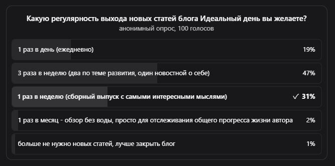 Но меня напрягает, что у меня всего 100 человек, кто нашел время проголосовать. Это чрезвычайно низкая активность, вовлеченность. Возможно, я делаю что-то не так, как блоггер. Или попросту не дорос еще.