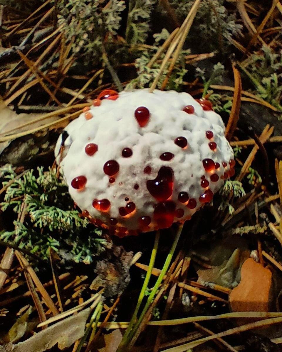 В молодом возрасте он выглядит как белая подушечка, из которой сочатся ярко-красные капли — это не кровь, а жидкость с пигментами и метаболитами, которые выделяются при высокой влажности.