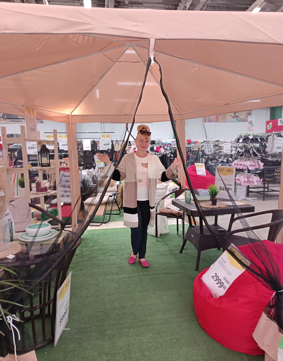 Как же усложнилась, хотя не скрою приятно, моя жизнь. Вчера приехали с дачи усталые, без сил...писала об этом здесь 👇 А сегодня с утра в Петербурге такой дождь зарядил, как из ведра. Ну, что делать, ехать по магазинам, закупаться, ведь завтра у нас на даче гости, официальное новоселье. Поехали на рынок. Кстати наш Колпинский рынок заслуживает отдельной статьи, когда нибудь я её напишу. У нас шикарный выбор овощей и фруктов причём по самой низкой цене по городу. *Не реклама. Никаких торговцев не рекомендую. Может быть где-то и ещё дешевле есть.... Но если сравнивать с теми, где я была у нас мне нравится больше всего. Закупились овощами, фруктами... купили рыбу, завтра будем зажаривать на решётке... Дальше поехали в ТРК, там ещё до купили недостающего. В магизине понравился выставочный образец. У нас есть своя беседка, но в этой то же что-то есть.. только на фото обратила внимание какой у меня мятый кардиган. Уж простите... Пришла домой погладила... Купили хорошие шампуры для люля