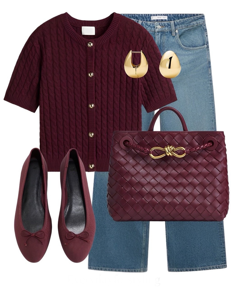 В прохладный день наденьте под кардиган тонкую молочную водолазку или майку с кружевной планкой. Сверху — песочный тренч: бордо с «тёплым бежем» всегда выглядит люксово. Балетки легко заменить на лоферы с масляным блеском — образ станет более «городским».