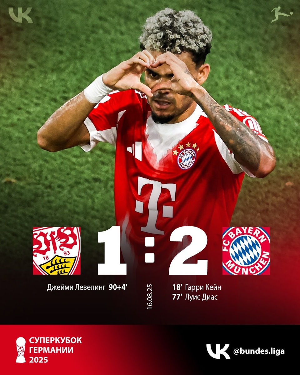 «Бавария» взяла Суперкубок Германии 2025 🇩🇪 Победу со счётом 2:1 в этой игре одержали мюнхенцы. Встреча прошла на стадионе «Штутгарт Арена». ⚽ 0:1 Кейн – 18' ⚽ 0:2 Диас – 77' ⚽ 1:2 Левелинг – 90+4' Кажется по игре сегодня вопросов к победителю не осталось. «Бавария» была явно сильнее «Штутгарта». Согласны❓