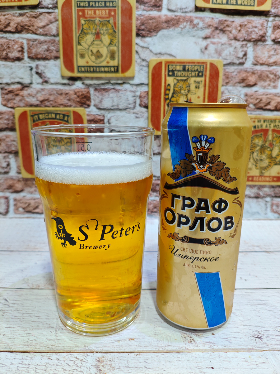 О каких орлах идёт речь? Зачем им граф? И при чём тут "имперское" светлое пиво? Так много вопросов и все без ответа. Изготовитель: ЗАО "Московская Пивоваренная Компания", г. Мытищи Московской области. На сайте пивоварни описание следующее: Пиво «Граф Орлов» возрождает страницы истории отечественного пивоварения, когда в пиве ценились чистый и благородный солодовый вкус, сбалансированный хмелевой тон и мягкая горечь. «Граф Орлов» – светлейшее пиво с благородным вкусом. ********************************************************************************** Плотность: 11.2%. Горечь: 16. Состав: вода питьевая, солод пивоваренный ячменный, хмелепродукты. Срок годности: 12 месяцев с хранением при температуре от 2℃ до +25℃. С даты розлива моей банки прошло 5.5 месяцев. ********************************************************************************** Пенка слабенькая и сдувается хоть и не полностью, но шустро. Аромат солодовый с кислинкой. Карбонизация высокая. Вкус солодовый сладковатый с небольш
