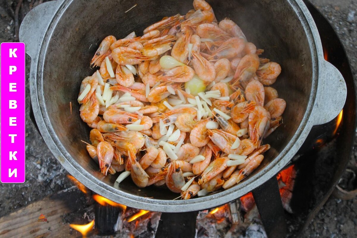 Как приготовить креветки в казане на костре. Ингредиенты: - 1 кг креветок (можно использовать варено-мороженые креветки); - 2 большие луковицы; - 4 зубчика чеснока; - 3 столовые ложки растительного масла; - Сок из половины лимона; - Соль, перец, зелень - по вкусу. Приготовление: 1)Нарежьте лук полукольцами, чеснок мелко порубите. Разогрейте казан на костре и налейте в него растительное масло. Обжарьте лук и чеснок до золотистого цвета, периодически помешивая. 2)Добавьте креветки в казан и обжарьте их вместе с луком и чесноком, помешивая, в течение 5-7 минут. Если вы используете вареные и замороженные креветки, то время обжарки можно сократить до 3-4 минут. 3)Посолите и поперчите креветки по вкусу, добавьте зелень и сок лимона. Перемешайте все ингредиенты снимите с огня казан. Дайте креветкам настояться в казане еще несколько минут. Подавайте креветки с гарниром из картофельного пюре или рисом. Можно также украсить блюдо свежими овощами и зеленью. Приятного всем аппетита. Тот самый шашл