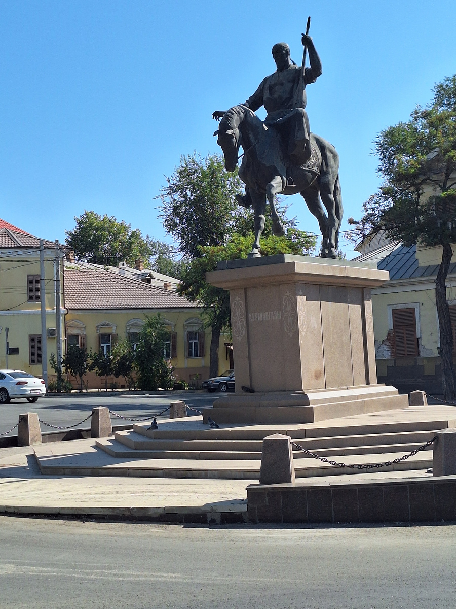 Первая остановка была недалеко от памятника Курмангазы Сагырбайулы, почитаемый у казахов композитор, памятник был открыт 13 декабря 2008 года, памятник стал подарком Казахстана к 450-летию Астрахани, скульпторы Токтарбек Рахиев и Едиге Рахманов являются авторами памятника.