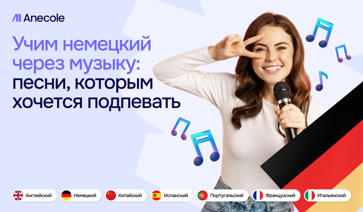 Изучение немецкого языка через песни — это не только эффективный, но и вдохновляющий способ погрузиться в язык. Музыка помогает лучше воспринимать произношение, интонацию и ритм речи. Слова и выражения, услышанные в песнях, запоминаются легче и надолго. Кроме того, песни открывают доступ к культуре и эмоциям носителей языка, делая процесс обучения более живым и увлекательным. Даже если сначала многое не понятно, со временем вы начнете узнавать знакомые слова и фразы. Приходите на бесплатный урок в Anecole — и откройте для себя немецкий язык.