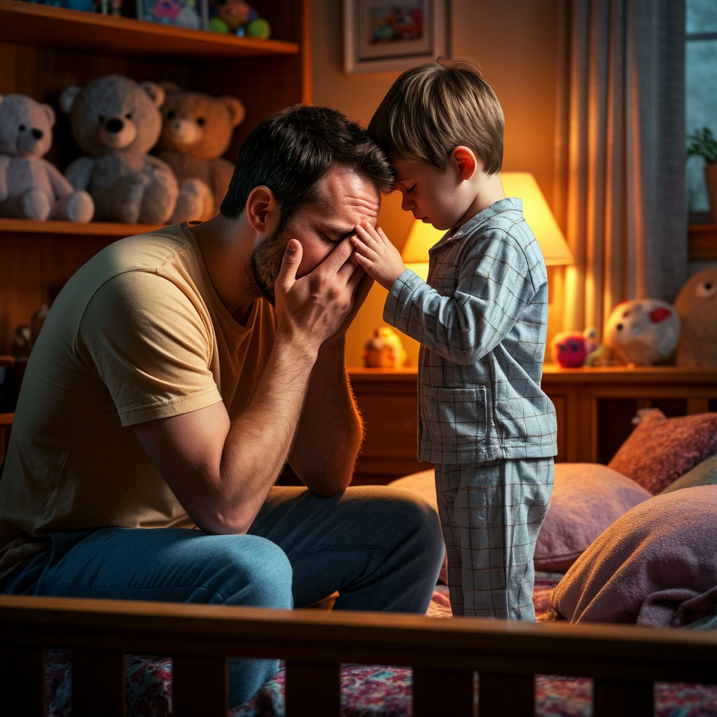 Максим сидел на краешке детской кровати, обхватив голову руками. По его щекам медленно стекали слёзы. Тимофей стоял рядом, положив маленькую ладошку на плечо отца.