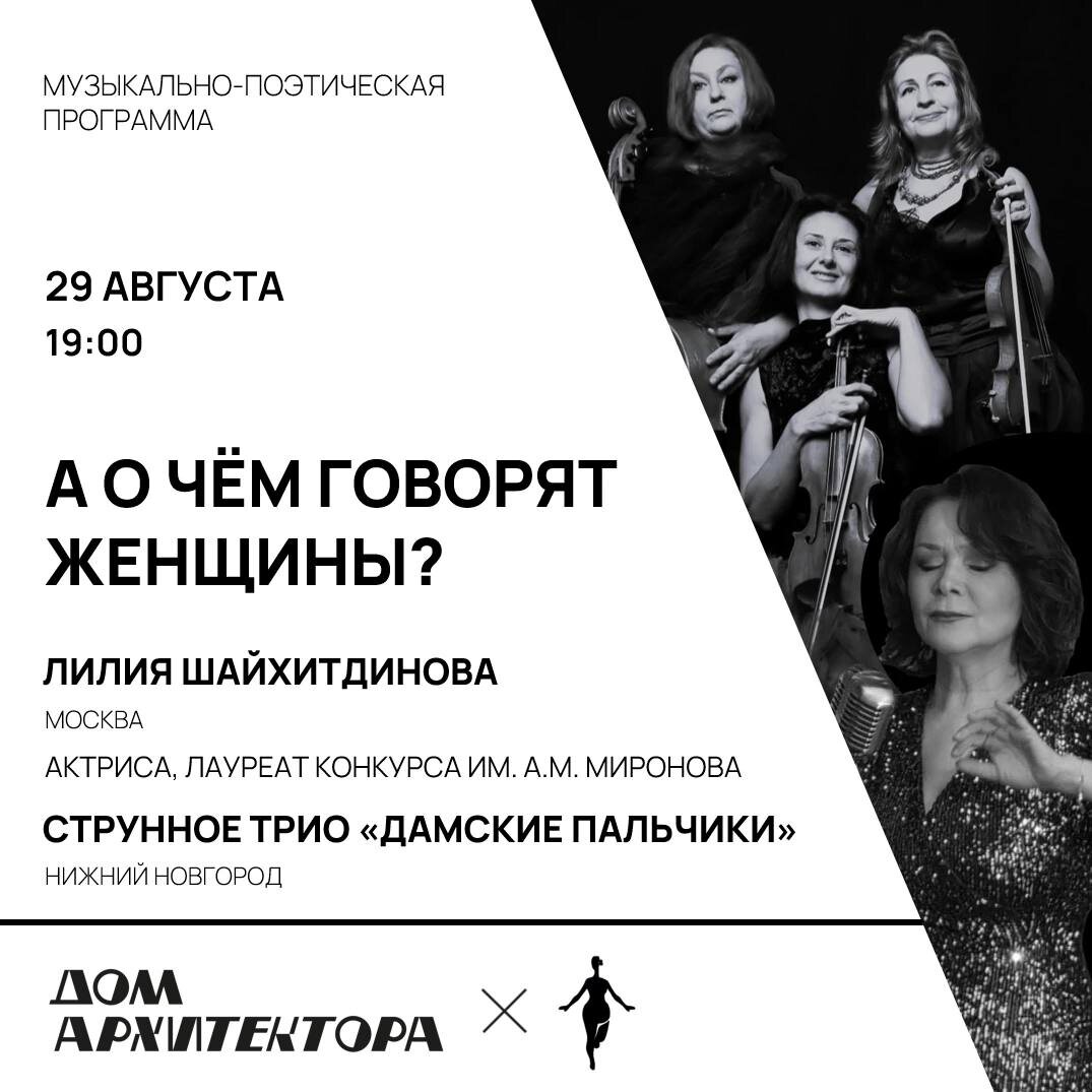 ДОМ АРХИТЕКТОРА_музыкальный Актриса Лилия Шайхитдинова и струнное трио «Дамские пальчики» перенесут зрителей на террасу уютного театрального кафе. В программе: живая музыка, убийственная самоирония, тончайший юмор и концентрированная женственность, а самое главное — авторские аранжировки известных мелодий разных лет и музыкально-поэтическое баловство! 29 августа в 19:00 в летнем дворике Дома Архитектора! 💰 Стоимость билета — 1000 рублей Приобрести можно у дежурного администратора в день концерта и по ссылке: clck.ru/3NfFHm
