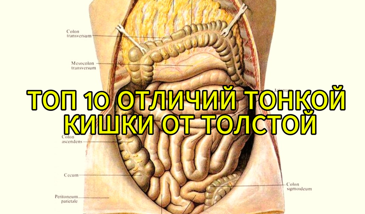 В просторах интернета многие пишут и говорят об отличиях толстой и тонкой кишок, но многие из них ошибочные. Правильно выделять функциональные и анатомические отличия. Функциональные признаки - это физиология тех или иных органов, например врач хирург не сможет отличить тонкую кишку от толстой, зная лишь функцию этих органов. Основные функции Тонкой кишки: 1. Химическая обработка пищевых масс ( химуса) кишечным соком, желчью и секретом поджелудочной железы. 2. Всасывание белков, жиров и углеводов. 3. Механическая обработка за счёт перистальтики. 4. Выделение ферментов, для расщепления химуса. 5. Эмульгация жиров. Основные функции толстой кишки: 1. Всасывание воды из химуса. 2. Переваривание клетчатки с помощью бактерий. 3. Образование витаминов К и группы Б. 4. Секреция кишечной слизи - защитная функция. 5. Формирование, накопление и выведение каловых масс. Так же важно дополнить, что химическая среда в тонком кишечнике слабощелочная, а в толстом кислая. Теперь об анатомическ