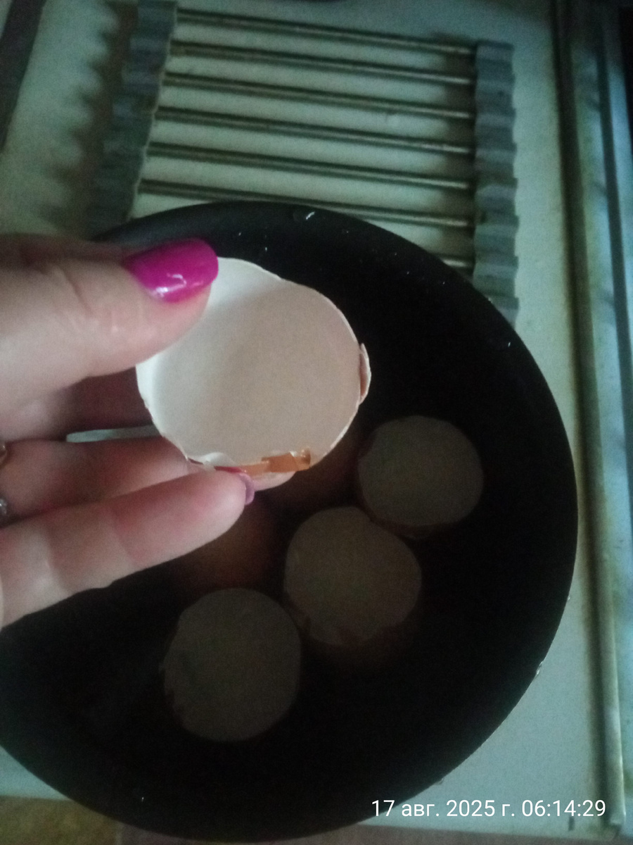 Поставьте в духовку на 10-15 минут. Скорлупа должна стать абсолютно сухой и слегка изменить цвет (может пожелтеть), но не подгореть! Запах должен быть нейтральным.