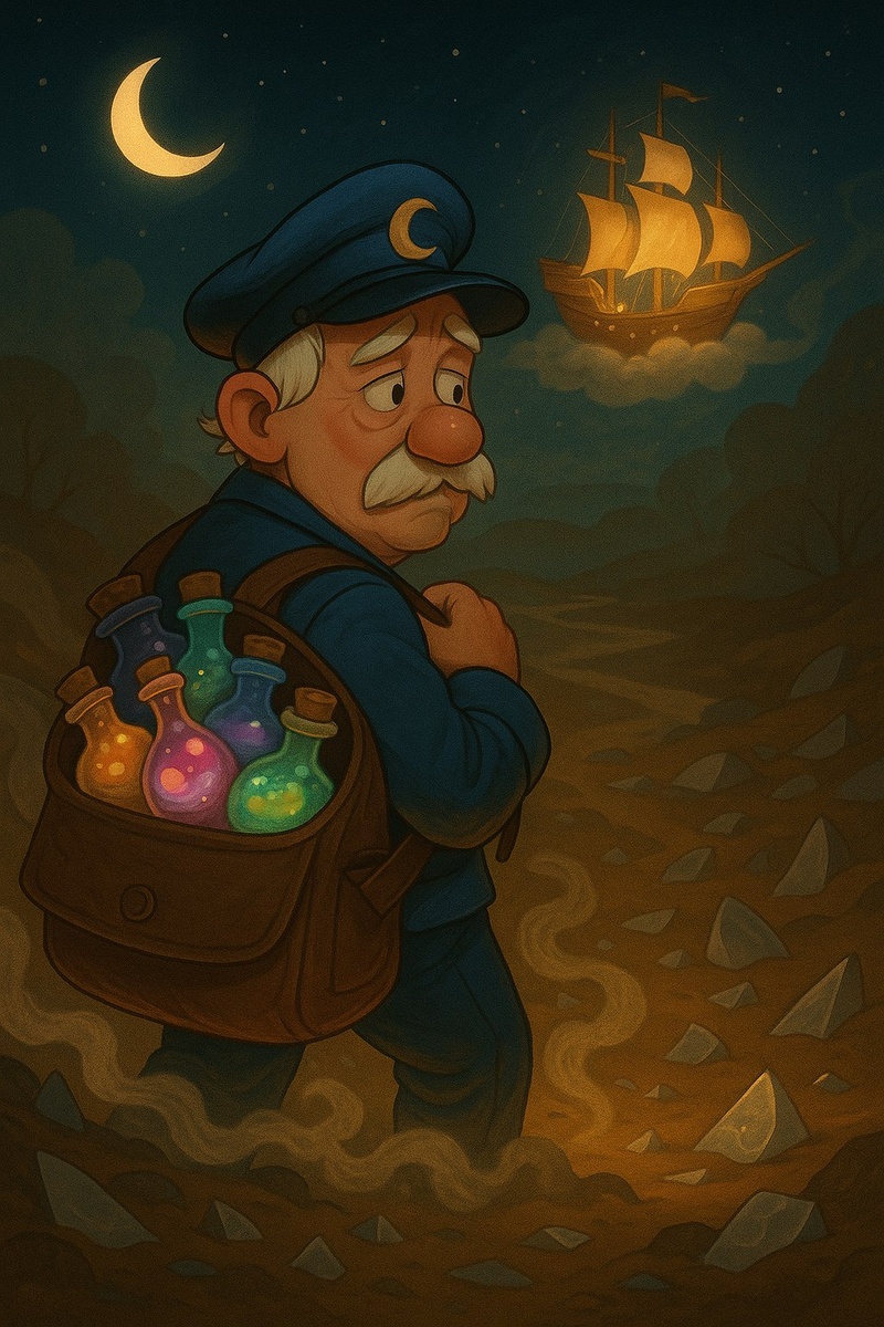 Сказка «Сонный Почтальон» В маленьком сонном городке, где даже ветер шептал ленивые колыбельные, жил необычный почтальон. Его звали просто — Сонный Почтальон. Но разносил он вовсе не письма и не газеты, а сны. На спине у него висел старый, но волшебный ранец. В нём хранились сотни крошечных бутылочек. Если присмотреться, можно было заметить, как внутри переливаются синие облака, золотые искорки, зелёные огоньки и розовые облачка — всё это были сновидения. Каждое утро Почтальон обходил город, тихо стучал в окна и аккуратно оставлял сон для каждого жителя. Детям доставались самые добрые: про летающих котов, говорящие деревья и мороженое, которое никогда не тает. Но однажды случилась беда. Во время обхода одна бутылочка выскользнула из его рук и разбилась. Это был лучший сон — «Сон о Летучем Корабле». Он был особенно любим детьми: в нём они поднимались в небо на корабле с парусами из звёзд и плыли по млечным волнам. Когда сон исчез, в городе начались кошмары. Дети плакали во сне, видел