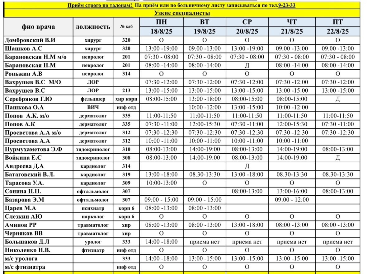 Актуальный график работы врачей с 18 августа
