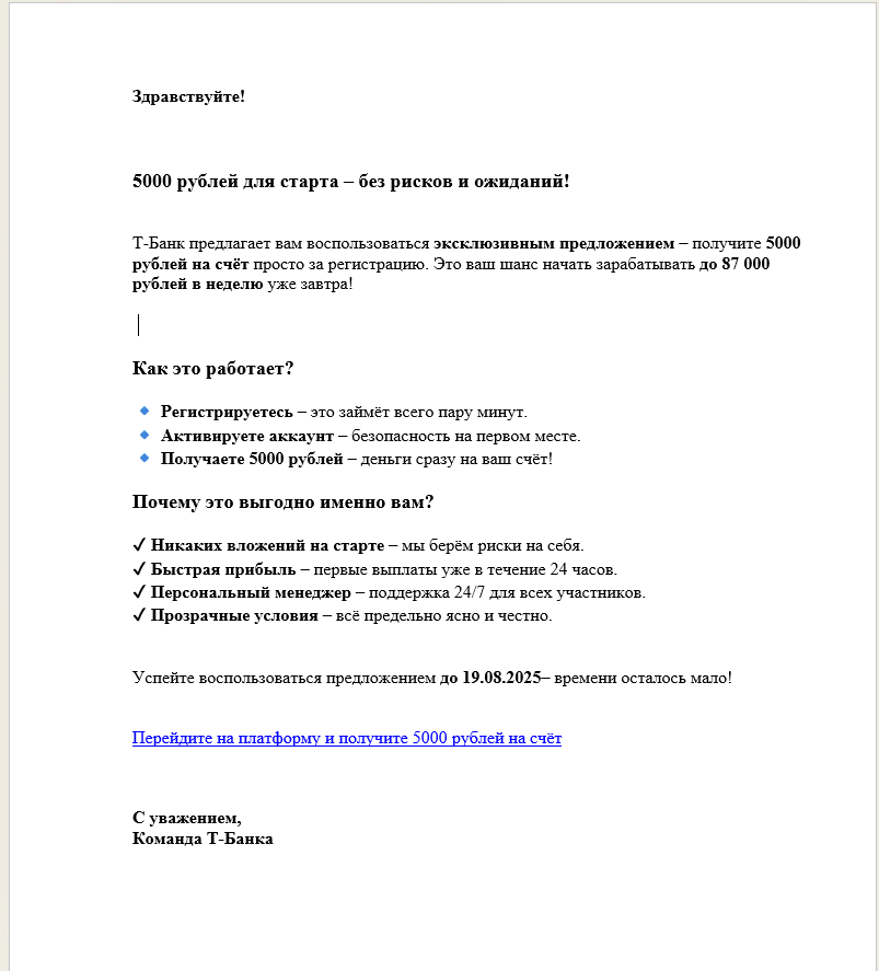 Прислали на почту очередное письмо, только видно ещё не в курсе что их ссылка уже не работает))) Сильно же они удивятся , когда поймут , что обосрались! Настоящий адрес Т-банка invest@tbank.ru Хотел бы я увидеть их лица в этот момент, когда они увидят что все их усилия пошли коту под хвост! Пишите свой комментарий и пожелания, делитесь своими победами над мошенниками в интернете!