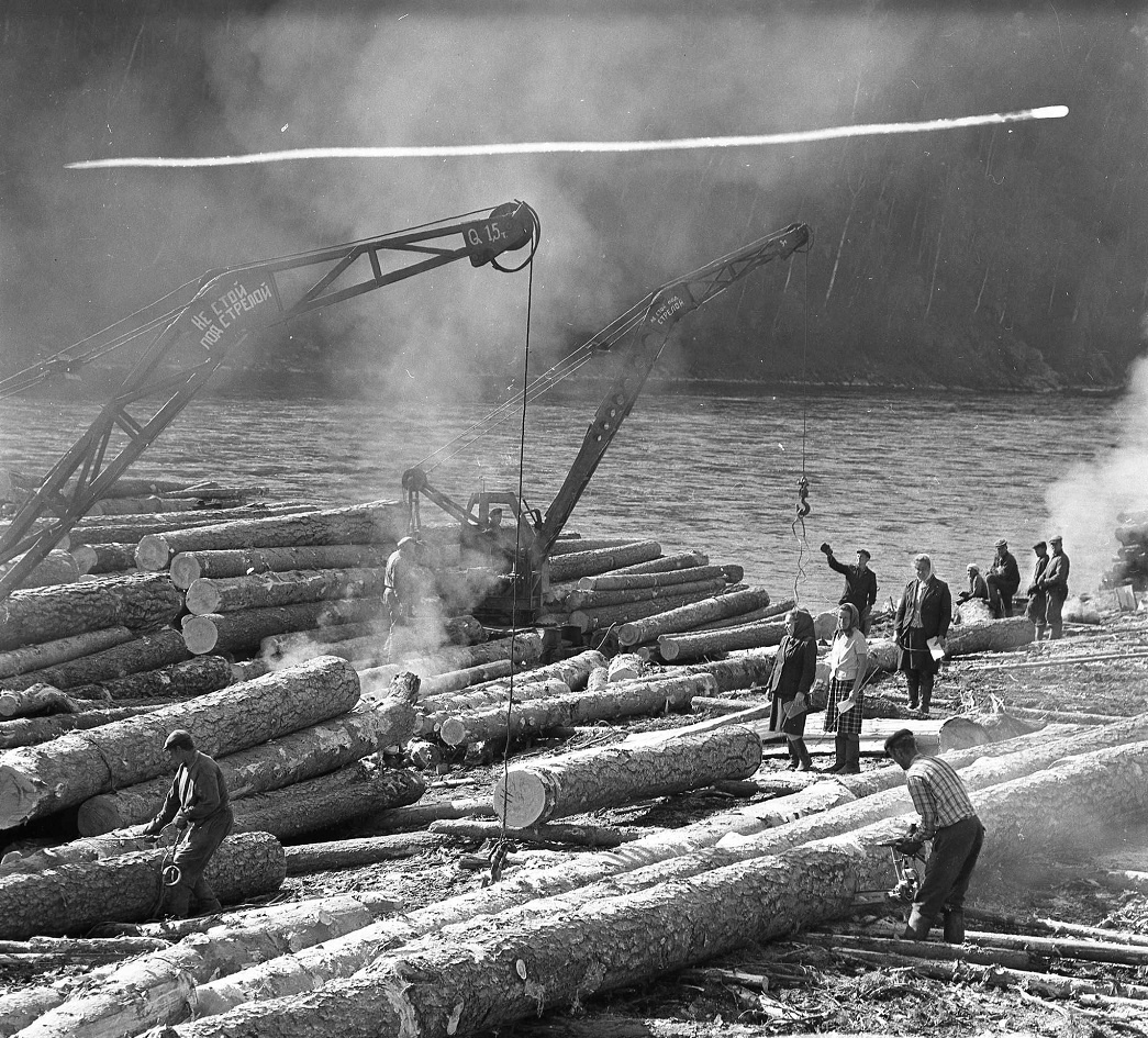 На фото: лесозаговки на реке Иркут, 1958.