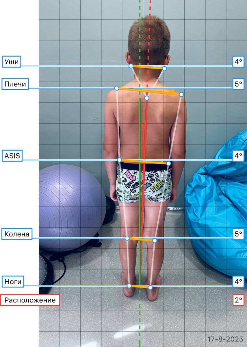 Посмотрите, какой прогресс у нашего мальчика! Значительно уменьшились перекосы во фронтальной плоскости — голову он теперь держит ровно