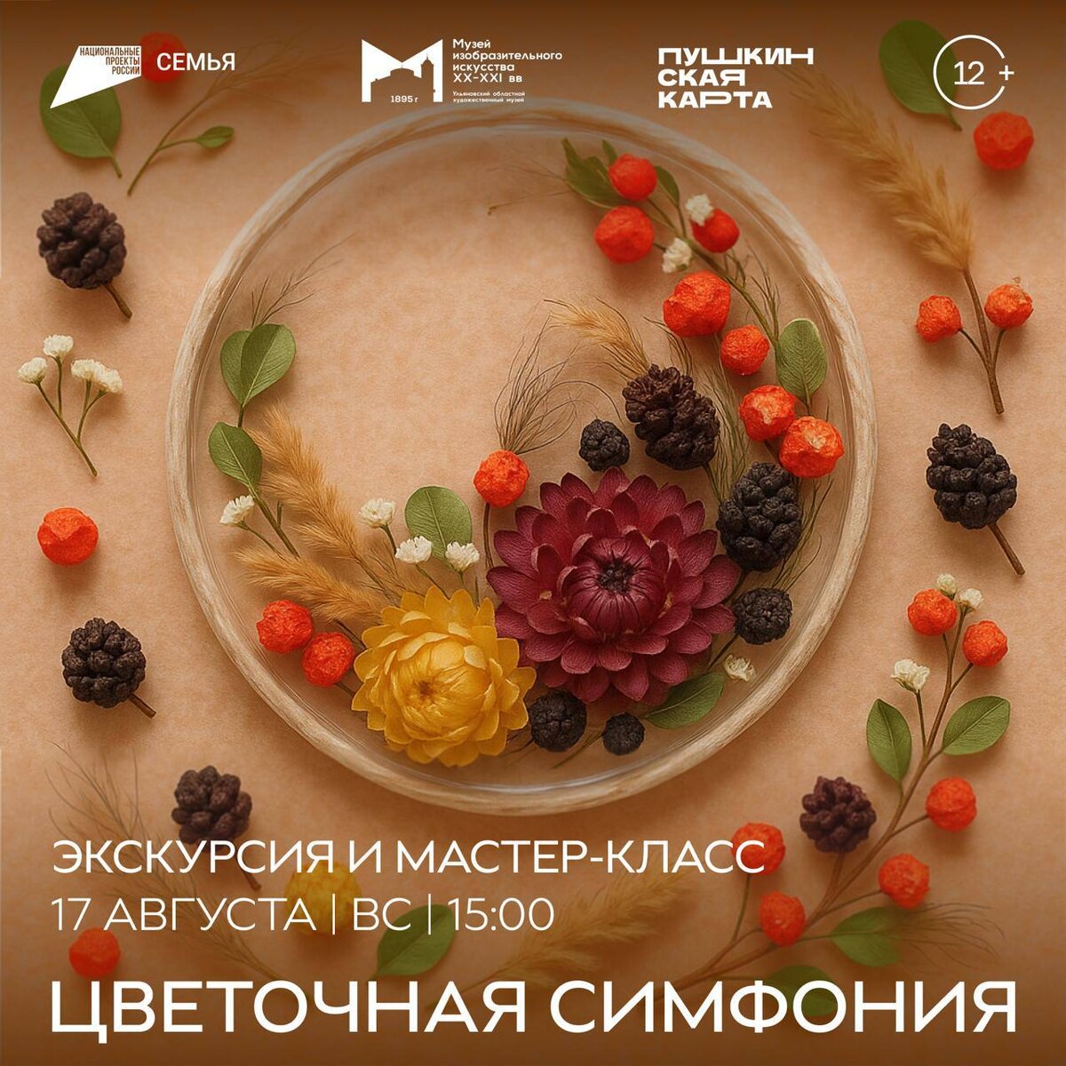Экскурсия и мастер-класс «Цветочная симфония» 🗓️ 17 августа, 15:00 📍Музей изобразительного искусства XX-XXI вв. На экскурсии посетители познакомятся с натюрмортами художников XX века, представленных в постоянной экспозиции: Мартироса Сарьяна, Алексея Кравченко, Натальи Гончаровой, Ильи Машкова, Елены Бебутовой-Кузнецовой. На мероприятии состоится мастер-класс по изготовлению декоративного панно из сухоцветов «Цветочная симфония». На МК участники откроют для себя удивительный мир искусства икебаны. Они узнают об истории икебаны, её стилях, секретах сбора и сушки природных материалов. А затем научатся создавать потрясающие объемные флористические композиции из засушенных цветов и растений, помещенные в прозрачный футляр. Продолжительность мероприятия – 1 час. Количество мест ограничено. Записаться можно по телефону 8(8422) 42-05-76. Билеты 🎟️ #17августа25