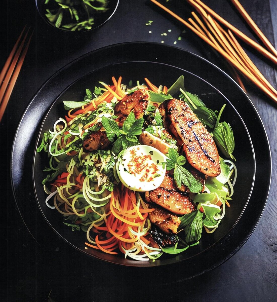Вьетнамский салат с лапшой 150 г сушеной рисовой лапши 2 куриные грудки без костей и кожи, нарезанные 1/4 стакана рыбного соуса 1/4 стакана рисового уксуса 2 ст. л. сахарного песка 2 зубчика чеснока, измельченных 1/2 красной луковицы, нарезанной соломкой и зеленый лук (белая часть) 1/2 стакана тертой моркови 1/2 чашки нарезанной свежей кинзы 1/2 чашки нарезанной свежей мяты 2 ст. л. растительного масла 1/4 ч. л. соли 1/4 ч. л. черного перца 2 ст. л. измельченного арахиса (по желанию) 2 дольки лайма (по желанию) 1. Отварите рисовую лапшу согласно инструкции на упаковке, пока она не станет аль денте. Слейте горячую воду и промойте проточной холодной водой. 2. В небольшой миске смешайте рыбный соус, рисовый уксус, сахар и чеснок, пока сахар не растворится. 3. Нагрейте масло в сковороде на огне выше среднего. Добавьте курицу и готовьте, пока она не подрумянится и не пропечется, около 5-7 минут. 4. Снимите курицу со сковороды и дайте ей остыть. 5. В большой миске смешайте охлажденную лапш