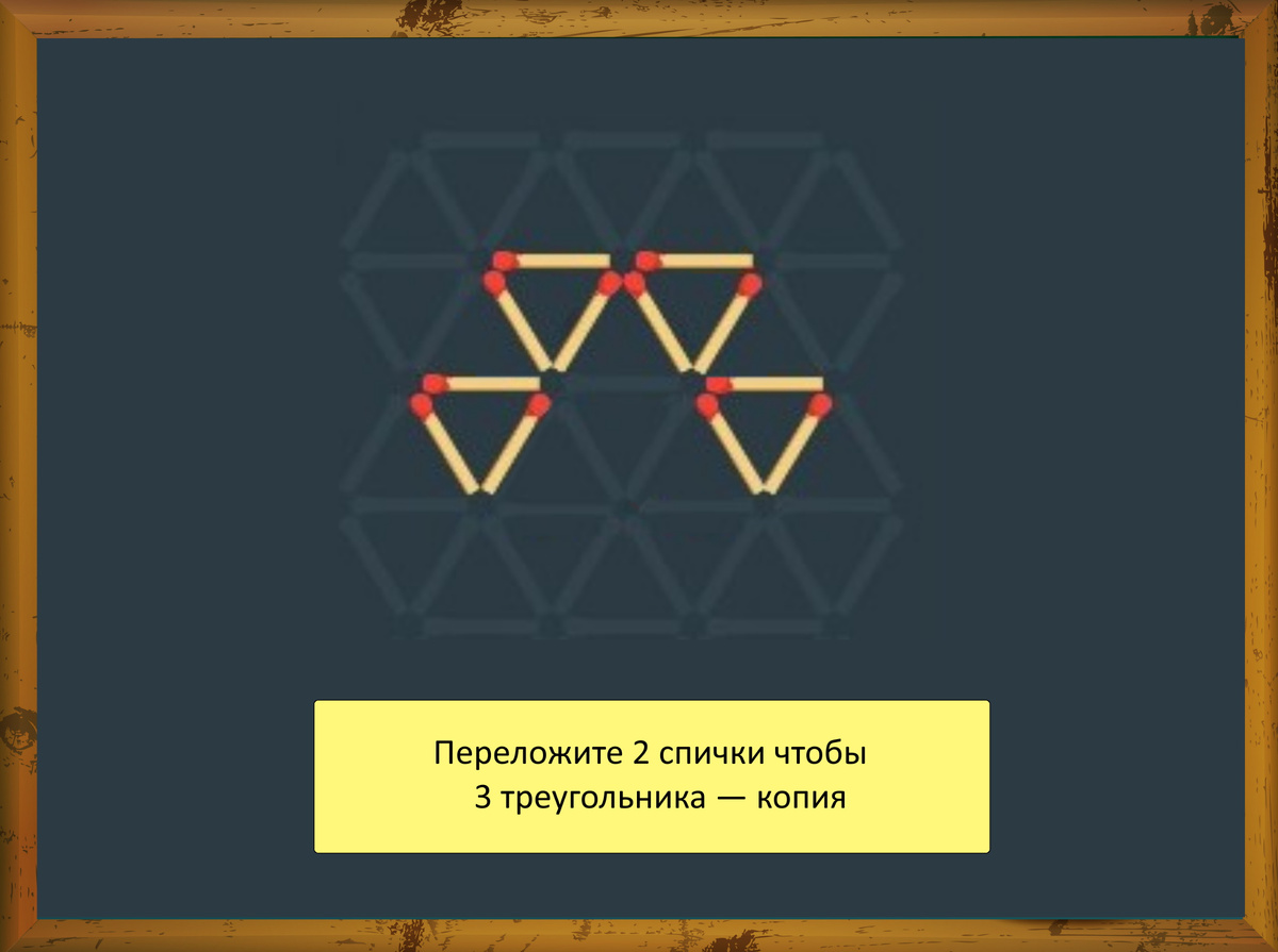Здравствуйте друзья сегодня для вас новое задание из раздела спички. Вам необходимо, переложить всего 2 спички чтобы получилось 3 треугольника.