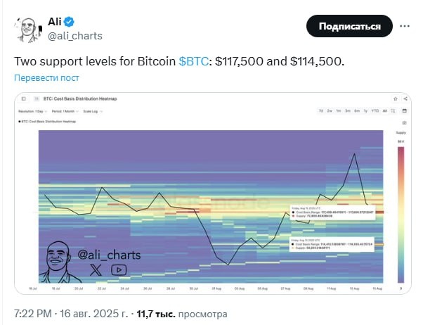 Ключевые уровни поддержки BTC: $117,5 тыс и $114,5 тыс