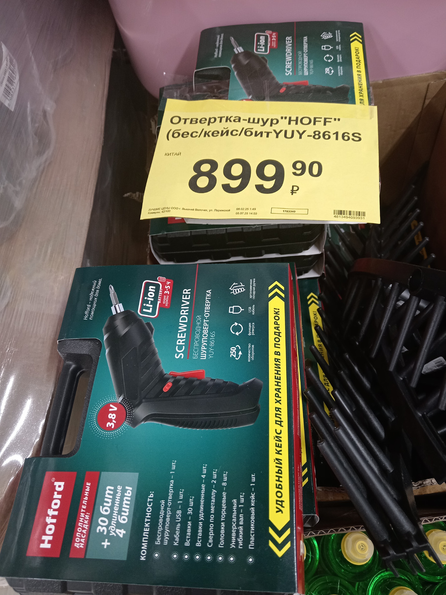 Добрый день всем! Сегодня мы с вами зайдём в магазин "Чеснок" и посмотрим на ассортимент товаров. Отвёртка - шуруповёрт в кейсе Hofford. Цена: 899,90. Водяные бомбочки. Много разноцветных, количество в наборе искала на упаковке, но так и не нашла. Цена: 99,90. Бордюр садовый гофрированный, длина - 9 метров, высота 15 см. Цена: 419,99. Щётка для обуви Alligator чёрная и бесцветная. Цена: 29,99. Ролик для чистки одежды, 40 листов. Цена: 49,99. Насос ручной, 850 мл. Цена: 199,90. Ножницы садовые. Цена: 469,90. Секатор, 16 см. Цена: 76,99. Набор садовых инструментов, 4 предмета. Цена: 239,90. Набор садовых инструментов: грабельки и лопатка. Цена: 189,90. Кружки для любимых напитков с надписями, которые утром поднимут настроение, 350 мл. Цена: 119,90. Семена горчицы, 0,8 кг. Цена: 119,90. Смесь семян "Быстрый газон", 0,8 кг. Цена: 329,90. Вико - овсяная смесь, 0,8 кг. Цена: 109,90. Вода минеральная "Дарида", лечебная, столовая, 0,5 л. Цена: 59,99. Масло подсолнечное Golden, 0,8 л. Цена: 99