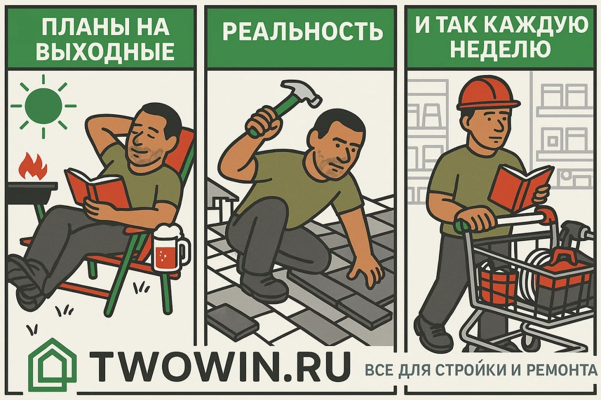 🏕 Жизнь прораба на выходных — План: отдых на даче с книжкой и шашлыками. — Реальность: крыша, молоток и тележка с крепежом. 🤷♂️ Так у нас каждую неделю. Но зато дом крепче, чем график отпусков. Twowin — всё для стройки и ремонта, даже если они застали вас врасплох.