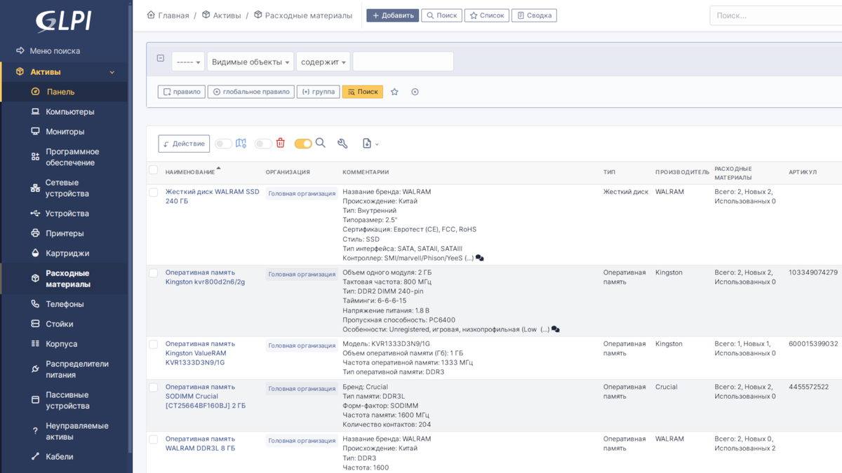 В работе любой IT-службы неизбежно возникает проблема учёта запасных комплектующих. На первых порах кажется достаточным держать информацию в голове или вести простой список, но с ростом парка оборудования такой подход быстро теряет эффективность. Ручной учёт запчастей превращается в настоящую головоломку: сложно отслеживать местонахождение деталей, контролировать их количество и состояние. Возникают неприятные ситуации, когда нужные комплектующие есть на складе, но никто об этом не знает, или, наоборот, тратятся средства на закупку уже имеющихся деталей. Озадачившись этой проблемой мы начали искать решение. Оказалось, что в GLPI заложена эта функция. О ней нам подсказали в чате "GLPI - русскоговорящее сообщество". GLPI предлагает продуманное решение для автоматизации учёта запасных частей. Она позволяет создать единую базу данных всех комплектующих, где каждый элемент имеет свой уникальный идентификатор и подробную информацию о местонахождении, состоянии и истории перемещений. GLPI — э
