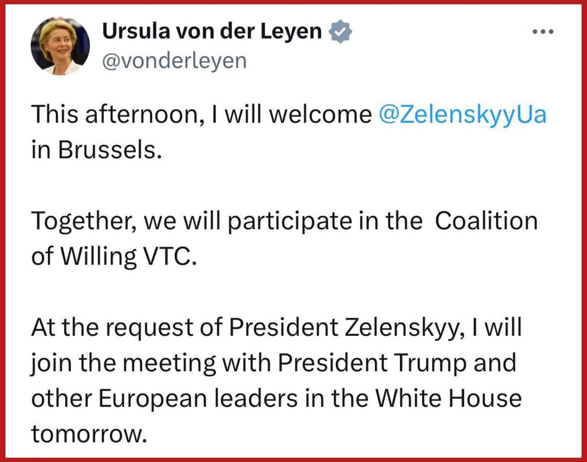 Глава Еврокомиссии Урсула фон дер Ляйен поедет с Зеленским на встречу с Трампом в Вашингтон «Сегодня днём я приму в Брюсселе Зеленского. Мы вместе примем участие в видеоконференции «Коалиции желающих». По просьбе президента Зеленского завтра я присоединюсь к встрече с президентом Трампом и другими европейскими лидерами в Белом доме» Наркоман без мамки никуда. А к Трампу тем более страшно. Поэтому компанию Володе и Урсуле составят 🔺Канцлер Германии Мерц 🔺Президент Финляндии Александр Стубб 🔺Премьер Италии Джорджа Мелони И конечно же самый романтический дружок наркомана - Эмануэль Макрон Подпишись на Телеграм Александр Семченко