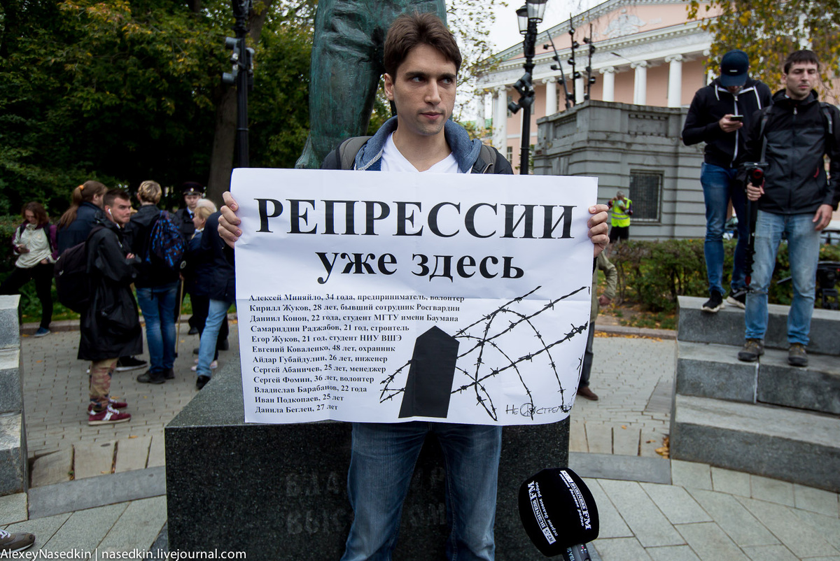 Вы же понимаете, в таких случаях происходят ужасающие вещи - массовый выход «приезжих» граждан на улицы с битьём витрин, бросанием дымовых шашек, коктейлей Молотова, кирпичей и палок; коллективный поджог покрышек; зажигание файеров; в общем - тот самый "майдан" и массовые беспорядки, которых все так страшно боятся. Ровно 6 лет назад в этот день, на волне протестов по поводу выборов в Мосгордуму, столичные полицейские решили избрать иную тактику и вот чем это обернулось. Тогдашняя акция состоялась в виде старых добрых одиночных пикетов на бульварах. И первым кого я встретил в тот день, оказался знаменитый в узких кругах пламенный борец дядя Гриша. Пикетчики по очереди выстраивались в нескольких точках Бульварного кольца - от Чистых прудов до памятника Высоцкому на Страстном бульваре. Всё забываю спросить как зовут эту женщину, с завидным постоянством выступающую практически на любых оппозиционных мероприятиях. А вот и Сергей Митрохин, без него картина была бы явно неполной. Идёшь такой
