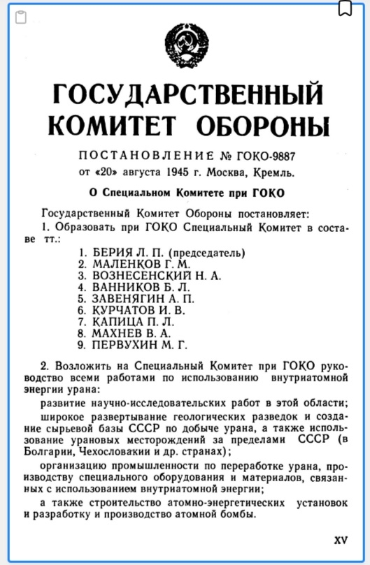 20 августа 1945 г. ПОСТАНОВЛЕНИЕ № ГОКО-9887 от «20» августа 1945 г. Москва, Кремль. О Специальном Комитете при ГОКО. С этого документа нынче ведут исчисление атомной отрасли в РФ. #80летросатому #последаматомногопроекта