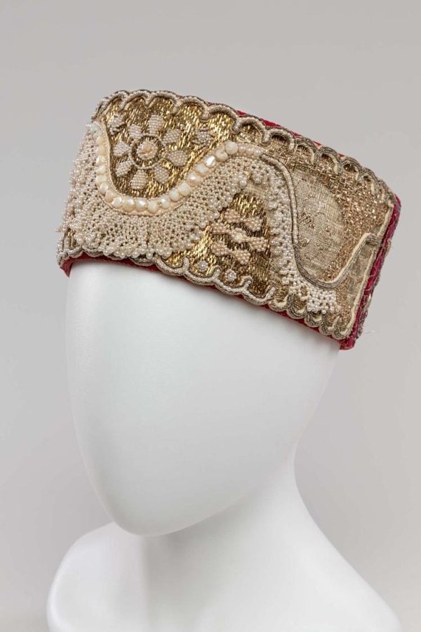 «Перевязка» – девичий головной убор. Русские, втор. пол. XIX в. «Перевязка» – девичий головной убор в виде прямоугольной полосы из кумача с картонной прокладкой внутри; в лицевой стороны перевязка обшита полосой позумента, поверх которого выполнена вышивки в технике сажения по бели крупным половинчатым жемчугом и стеклянными бусинами перламутрового цвета (фальшивым жемчугом). Орнамент геометрический (розетка, фестоны, крупная волнистая линия). К бели волнистой линии пришита сосборенная поднизь из более и менее крупных стеклянных бусин перламутрового цвета. Концы «перевязки» скрепляются с помощью пришитых к ее боковым сторонам шелковых лент в продольную полосу терракотового и синего цвета. подробнее: vk.cc/cN8Nck