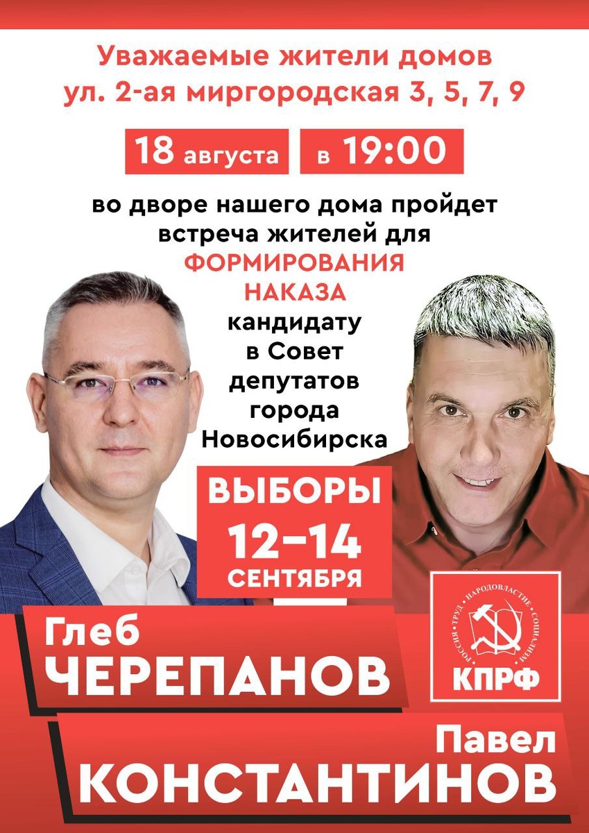 ВСТРЕЧА С КАНДИДАТОМ. 2-ая Миргородская. Завтра В понедельник, 18 августа, в 19:00, во дворе домов 3, 5, 7, 9 по улице 2-ая Миргородская состоится встреча с жителями кандидата в Горсовет Глеба Черепанова. Я тоже приду на встречу, чтобы вместе с Глебом ответить на ваши вопросы и принять наказы. От Павла Константинова